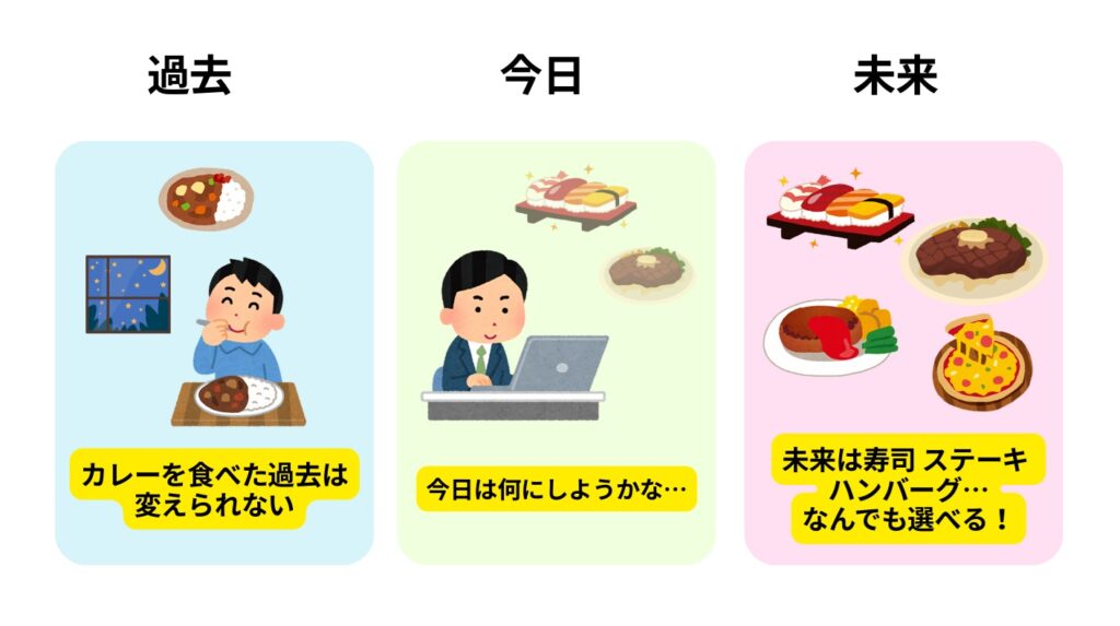カレーを食べた過去→現在←お寿司、ステーキ、ハンバーグ…なんでも選べる未来